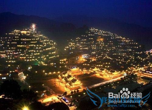 踏入苗疆腹地千户苗寨的一瞬间,首先映入眼帘的是一排排坐落有序、依山而立而富有民族特色的木质吊脚楼。远远看去,整个村寨就像一个巨大的金角牛头,尤其是在晚上的时候,当夜幕还未降临,走向观景台,伴着春雨一样寒颤的小风,倚靠在观景台的“美人靠”上,眺望远处苗寨的灯光如繁星点点,世外桃源的感觉油然而生。那幅夜景更是让人流连忘返,千盏明灯把整个村寨装饰得更加美丽,构成了一幅亮丽的景色,真有“疑是银河落九天”的梦幻。