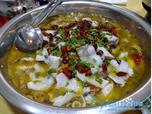 巴山人喜欢吃麻辣也喜欢吃酸,酸菜鱼就是酸而美味。酸菜鱼是采用先炒佐料,后加鱼炖煮的方式做成的,下面是煮好的酸菜,中间铺的是煮好的白色的鱼肉片,肉香嫩滑,然后在最上面均匀的放一层香菜沫,再撒上一层芝麻,汤上面还飘着薄薄的一层香油花,夹一块鱼肉,喝一口酸汤,感觉美极了。