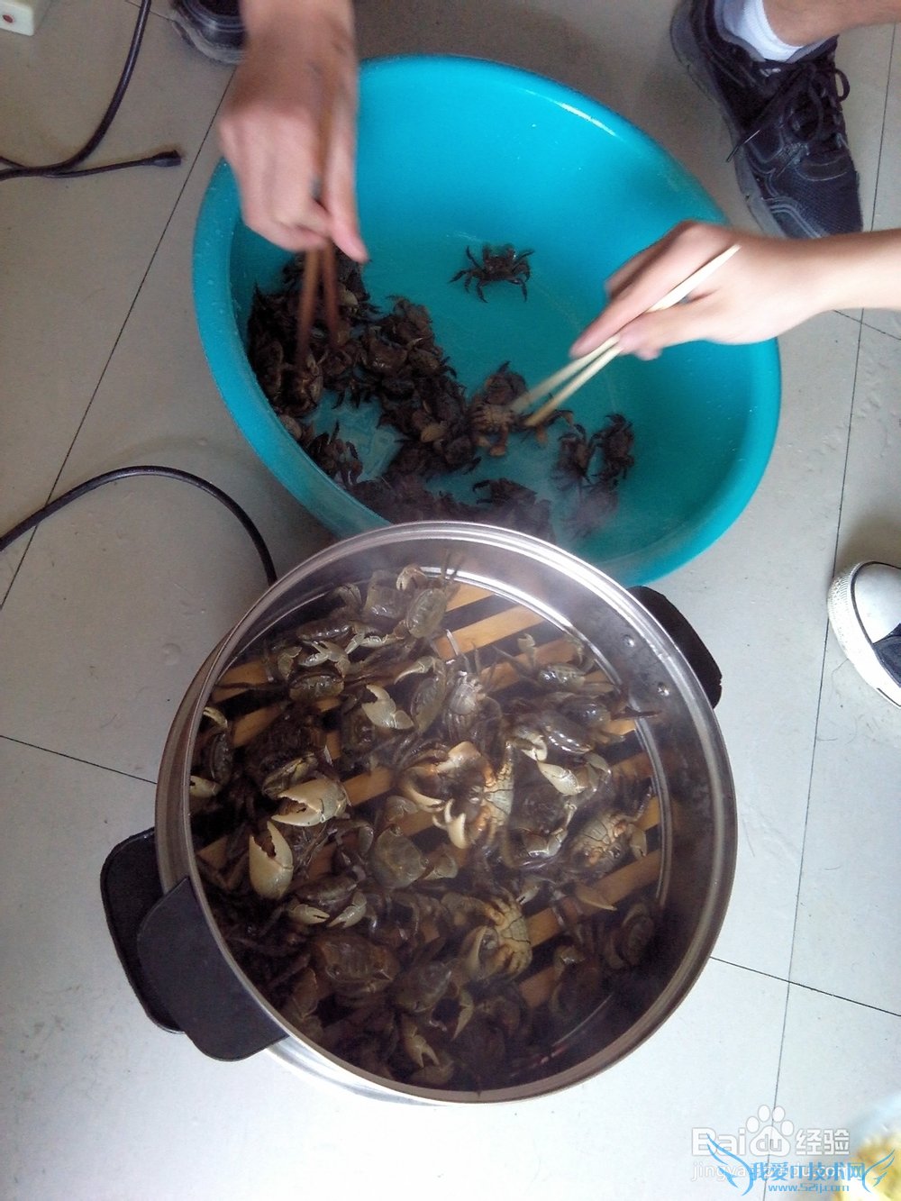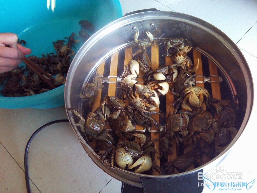 第二步,准备好蒸锅,放3-4厘米水,烧开之后开始放螃蟹,大的先放,然后放好螃蟹,记得撒上姜末蒜末,螃蟹性寒,姜能弥补一些