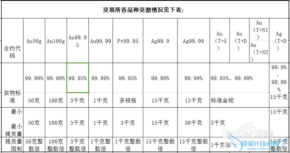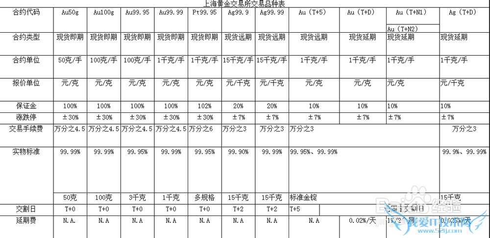 交易的贵金属包括黄金、白银、铂金3种,目前共有12个挂牌交易品种:黄金有Au99.95、Au99.99、Au50g、Au100g四个现货即期品种,Au(T+5)现货远期交割品种,Au(T+D)、Au(T+N1)以及Au(T+N2)3个延期交收品种。白银有Ag99.9和Ag99.99两个现货远期交割品种和Ag(T+D)延期交收品种。铂金只有Pt99.95现货实盘品种。各交易品种情况参见下表