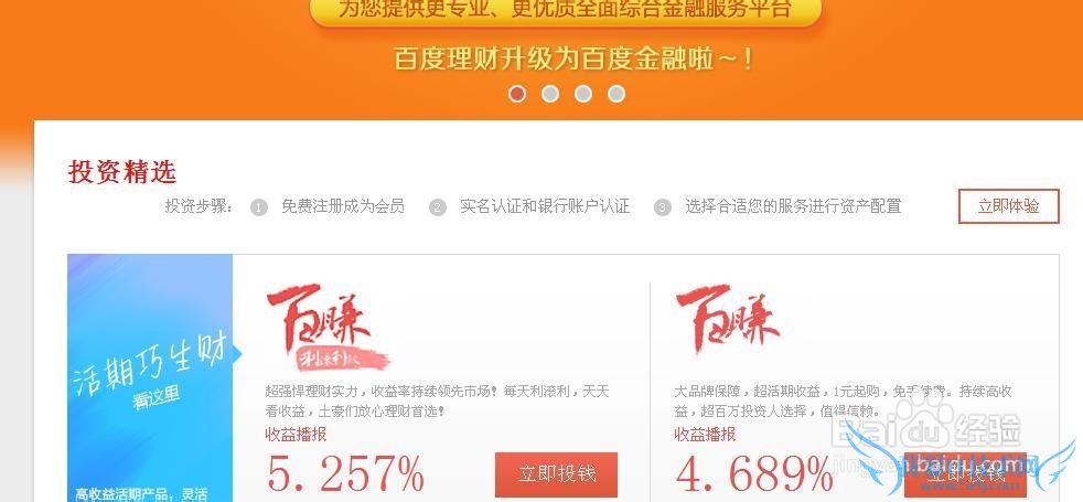 ,1、首先,您需要事先登录百度,在浏览器地址栏中输入百度理财官方网址(并回车进入,进入后登录您的账户。2、在页面中切换到第一个幻灯片页面,然后点击页面中的“立即体验”按钮,此时会弹出一个对话框,1、免费注册成为会员2实名认证和银行账户认证3选择合适您的服务。