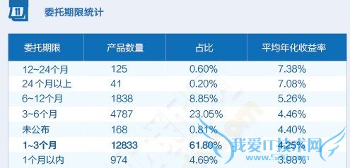 按委托期限统计,1-3个月和3-6个月的理财产品合计占比超八成。收益率方面,基本上是期限越长平均年化收益越高。其中,期限在12-24个月的理财产品平均年化收益率最高,达到7.38%。