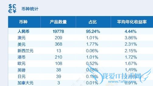 按币种统计,人民币理财产品的占比达到95%以上,平均年化收益率最高,达到4.44%。外币产品中,澳元理财产品实际收益率领先,平均年化收益率为3.86%,但优势不大。