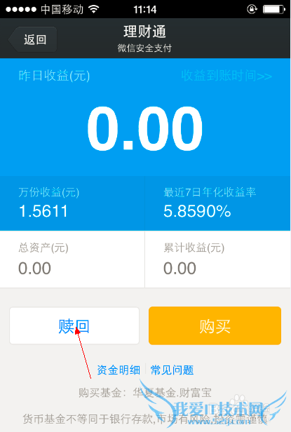 微信支付的赎回也是直接赎回到银行卡。如图所示,点击“赎回”。