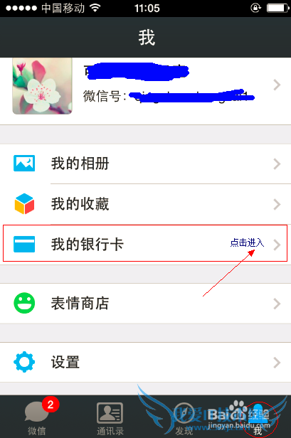 打开微信软件,登陆账号。首先点击右下角“我”,如图所示。之后再点击“我的银行卡”进入。