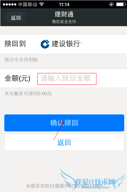 之后会出现下图所示。输入要赎回到银行卡的金额,然后点击“确认赎回”。