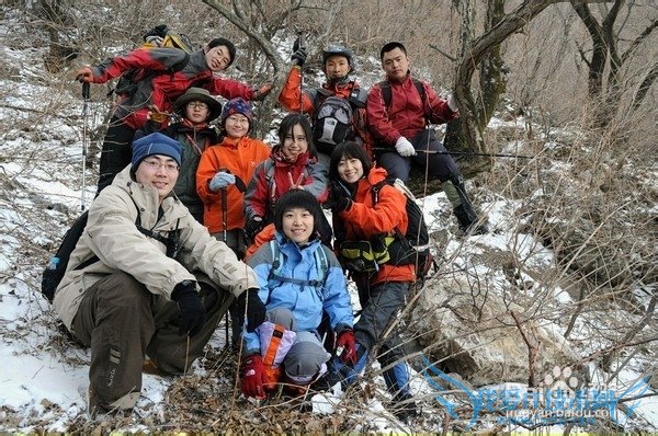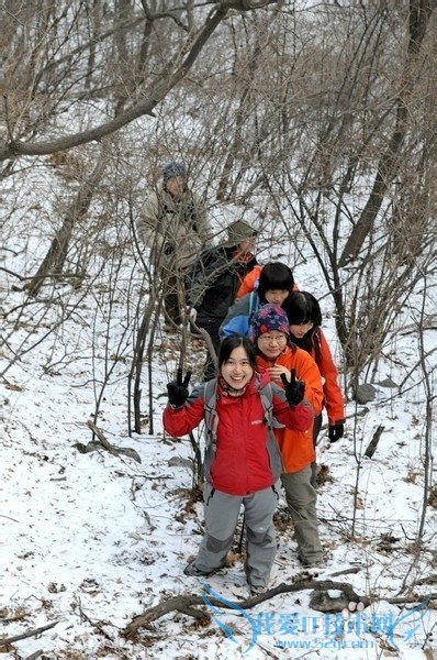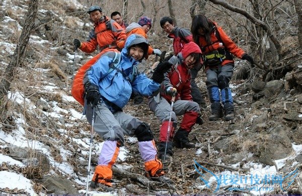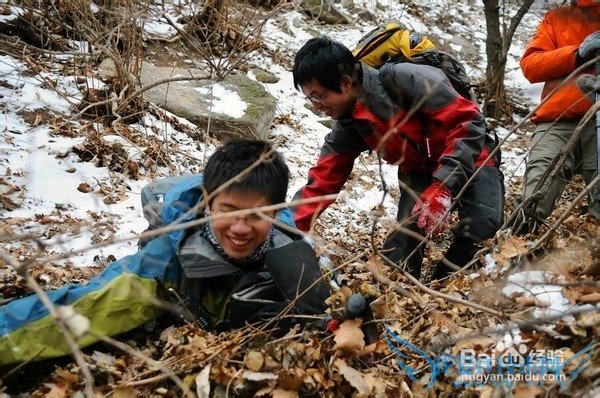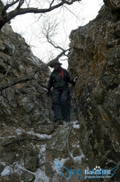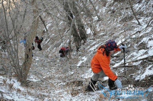 前行二三十米就遇到了一个陡坡,这个坡要在平常爬也不算啥,主要是刚下过雪,石头特别滑,几个MM有些吃力,didi好像是个新人,胆子较小,腿部力量也不足,看来是个重点照顾对象。