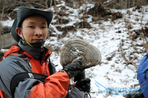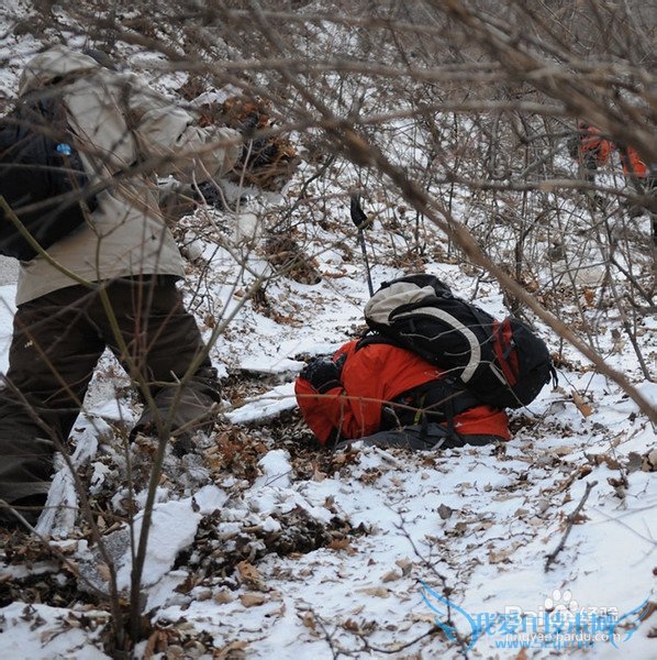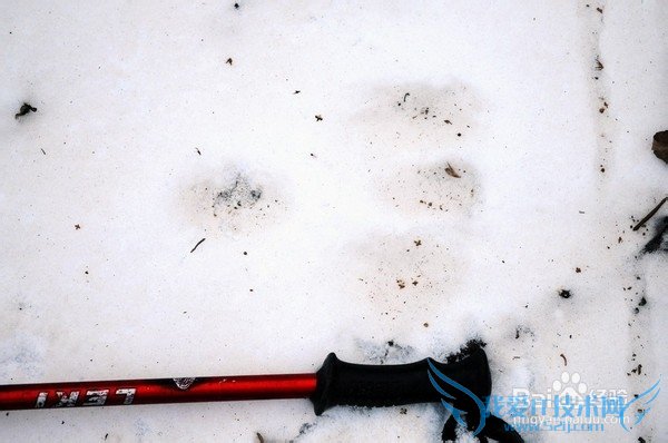 大概在海拔1100米左右的地方雪开始厚起来,沿着沟一直走发现前面的路越来越不明显了,雪地上看到很多动物的脚印,其中有一串特别大,和我的手差不多,前面三指,后面一指,也有前面四指后面一指的,不知道是什么动物留下来的。前方林子越来越密,不太好钻了,我们发现左手处有一条沟,貌似还比较好走,于是决定走左边,我先去前面探了一下路,没走两步“扑哧”一下就陷了进去,原来这条沟里全是落叶,落叶上面又盖了一层雪,足有半米多深,鞋里一下子灌了好多雪,我赶紧把右脚的鞋脱了下来磕里面的雪,一个没拿住,鞋脱手了,顺着沟叽里咕噜滚出好几米,我这个气啊,只能一蹦一蹦的下去拣鞋,雪那么深,根本蹦不起来,结果右脚袜子上沾了更多的雪。