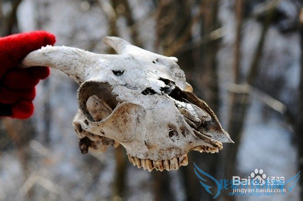上山点的标志是土路边的一块大石头(大概一米5高),大石头正对着的小路就是上山点。开始路比较明显,翻过一个很小的垭口,继续沿梯田右侧小路行走,到一处分叉点,左侧有条较明显小路,直行的话路就不明显了,在这里发现了一个山羊头骨,在小蛇的游记中也提到了,说是特意留下来做路标的,所以我们在这里左拐,并且在旁边的树枝上系了一根红绳。