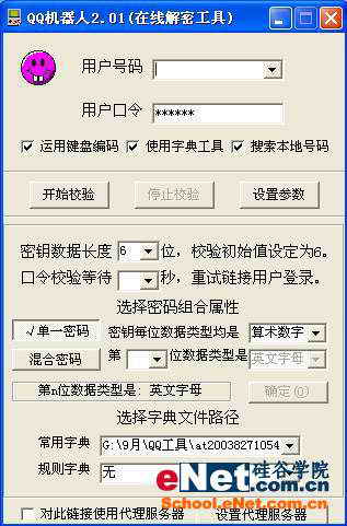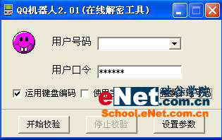 该软件使用方法很简单,只要在“用户号码”中输入要在线破解的QQ号码,然后点击下面的“开始校验”按钮即可启用QQ机器人逐一检验QQ密码,直到通过服务器的验证为止。