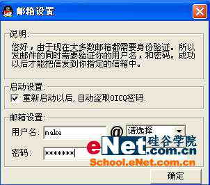 首先在“邮箱设置”中设置好你用于接收QQ密码的邮箱,然后勾选“重新启动以后,自动盗取QQ密码”,然后点击“确定”即可。