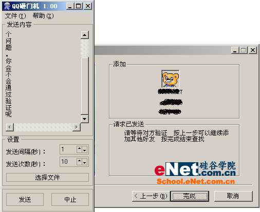 “飘叶千夫指”等工具只能对QQ好友进行攻击,具有很大的局限性。但“QQ砸门机”却是针对非QQ好友的一款工具,利用QQ添加好友需要通过验证的步骤,向指定QQ号发送大量请求信息。