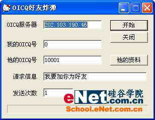 此软件使用比较简单,只要你输入你自己的QQ号码,以及你需要添加的QQ号码,在“请求信息”一栏中输入你的请求信息,输入发送次数,然后点击“开始”按钮即可(OICQ服务器一栏不用管它,选择默认的即可)。