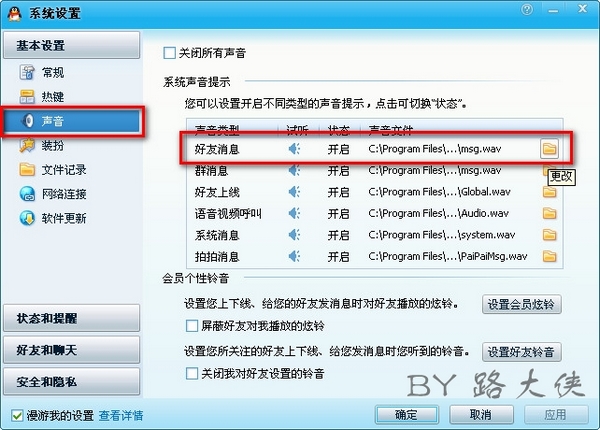 同样的道理,也可以更换群消息、好友上线、系统消息等声音。