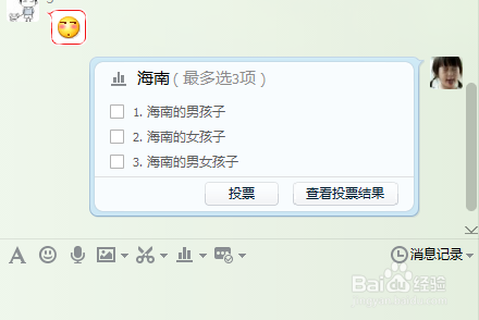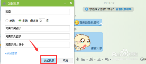 答:登录QQ,打开好友或讨论组聊天对话框,在对话框中点击聊天输入框上方的“发起投票”图标按钮, 输入投票主题,选择“单选/多驯,输入投票选项内容,然后点击“发起投票”按钮。若投票选项多于3个,您可以添加选项。 发起投票后,您的讨论组好友纷纷前... >>详细