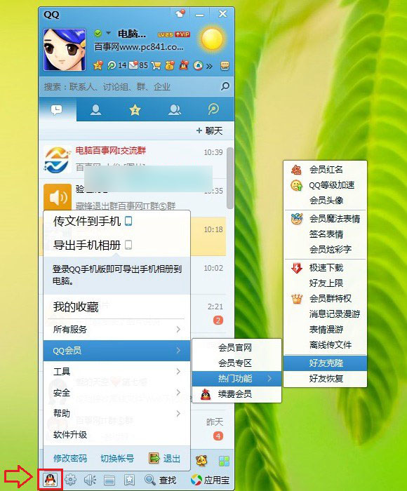 一、在电脑中登陆需要克隆好友的QQ,然后点击下方的“企鹅”图标,依次选择“QQ会员”--“热门功能”--“好友克隆”,如下图所示: