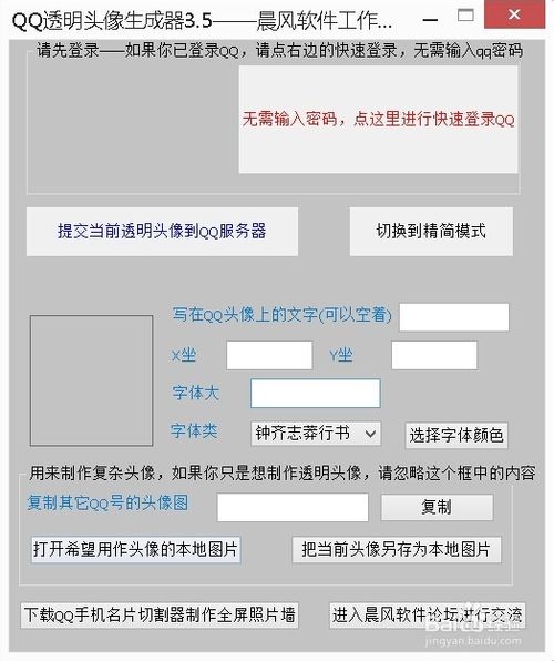 6、在复杂模式下,点击打开希望用作头像的本地图片,打开之前制作好的图片。需要注意的是,这里必须要填文字,否则无法提交。可以填写符号“.”,通过坐标,将点挪至文字上。点击提交当前透明头像到QQ服务器即可。