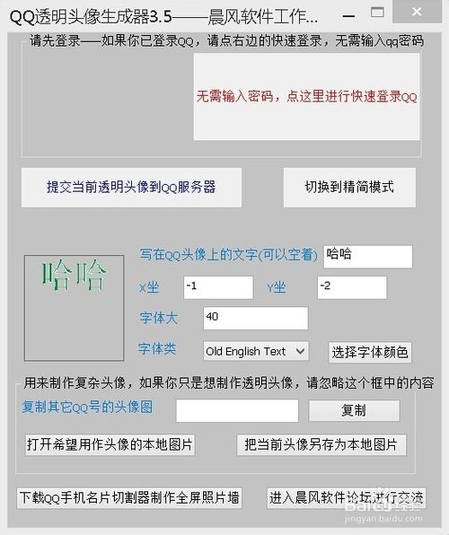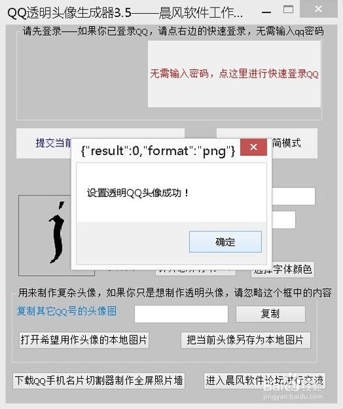 答:你好!下载QQ透明头像生成器,下载地址如上。建议下载时选择将文件放在电脑桌面。 一、打开透明头像生成器,如没有登QQ,输入QQ帐号和密码登录,如图左边红圈部分;如果登了QQ,点击一下“快速登录”: 二、在弹出的提示框里面,点“快速登录”,稍... >>详细