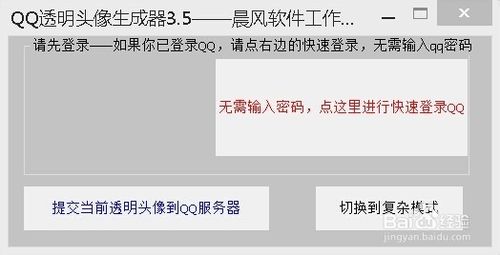4、打开软件后需要登录qq,这里如果你电脑已经登录的QQ,可以使用快捷登录,较为安全。如果你要制作的是完全透明的头像,在这里就可以直接点击“提交当前头像到QQ服务器”即可,随后,我们可以在手机qq上查看效果。