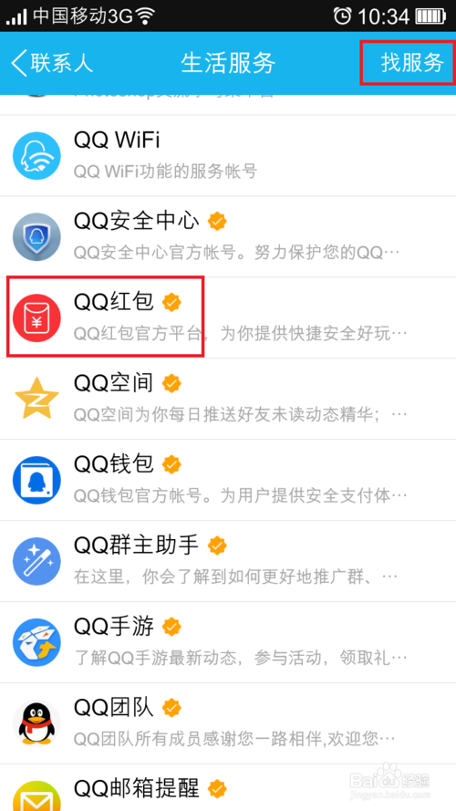 1、首先,需要你的QQ版本是最新版的,然后关注 QQ红包 在生活服务中,搜索QQ红包进行关注就行