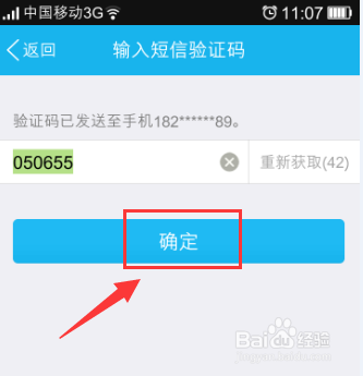 5、这个时候我们会进行短信认证,系统会发生一个验证码给我们填写的手机号码,我们输入验证码,点击 确定。
