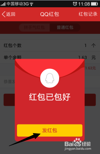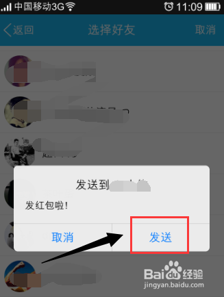 8、点击返回就可以看到红包已经打包好啦。我们点击 发红包 ,然后选择发送的好友即可。