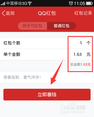 3、我们选择 普通红包 ,然后在页面上输入红包个数以及金额。点击图中的 立即塞钱 选项。