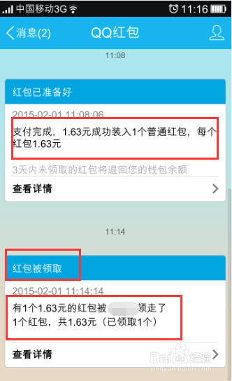 9、发送后好友收到红包,打开红包后,我们会收到系统消息,如下图所示