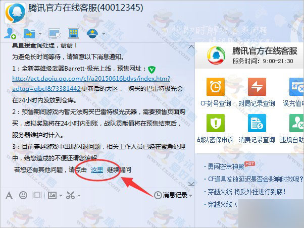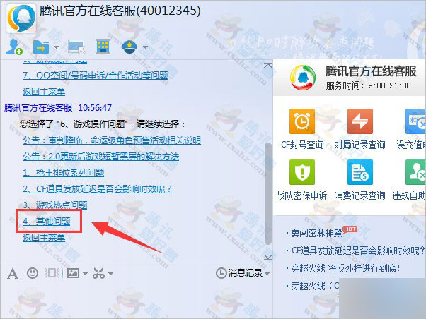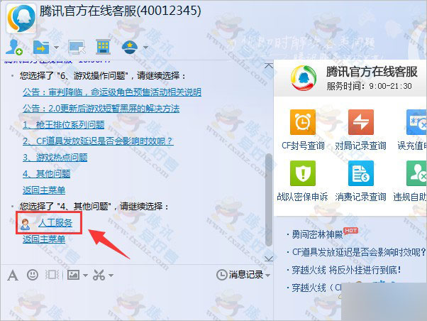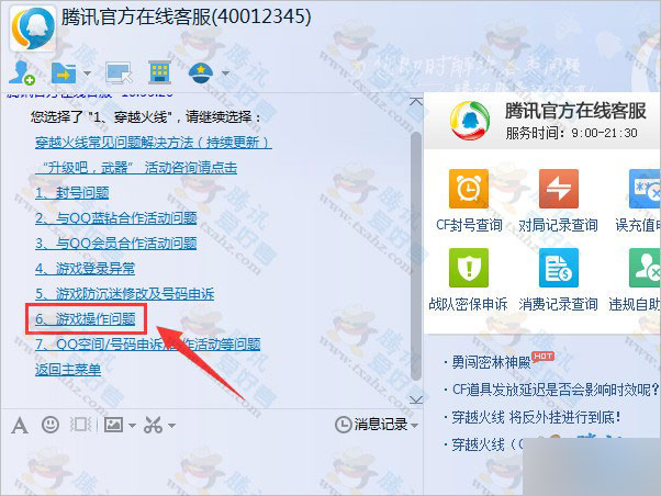 1、打开 http://kf.qq.com/game/business.html?code=cf 点右侧对话客服,选择游戏操作问题。