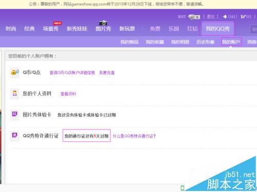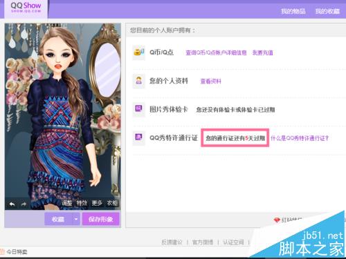领取成功之后,可以在我的QQ秀——我的账户中看到QQ秀通行证,通行证有效期为5天,你可以在QQ秀商城中,免费保存全场普通QQ秀(但是LV2、LV6物品除外)。