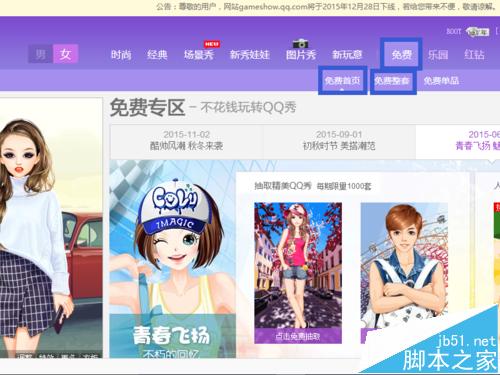 点击首页——免费——免费首页/免费整套/免费单品,同样可以免费保存和免费抽取漂亮的QQ秀。同时点击时尚——推荐搭配——本周主题,也可以免费领取最新的整套QQ秀。