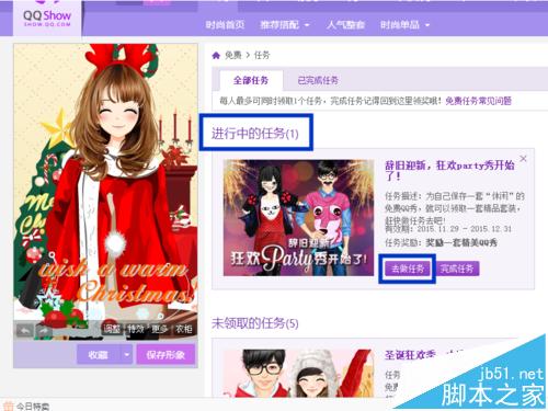 点击“去做任务”进入新的任务页面,可以看到进行中的任务(1),继续点击下面的”去做任务“,按照提示完成任务。任务的内容就是让你保存一套风格的免费QQ秀(例如保存一套”休闲“的免费QQ秀),按照提示随便点击一套保存就行了。