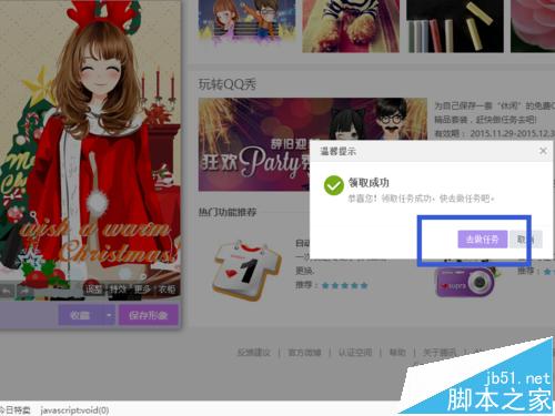 保存成功之后,要回到原来的页面点击”任务完成“,系统会弹出一个消息框,提醒你任务已经成功完成,并送你一套精美QQ秀。完成1次任务之后,按照提示继续完成剩下的两次任务。(剩下的任务在“未领取的任务”版块)