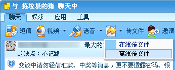 方式1:选择离线传文件方式进行传输。当好友不在线时,在与好友的对话窗口中选择“传文件”里的离线传文件菜单项,开始进行离线传文件的内容选择: