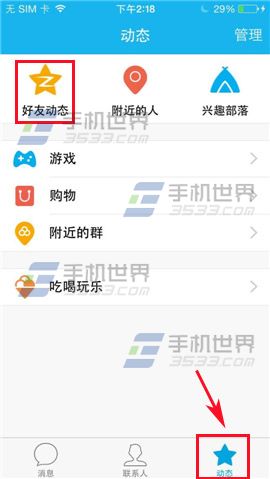 1)首先打开手机QQ,点击【动态】,点击【好友动态】,点击自己【账号头像】。(如下图)