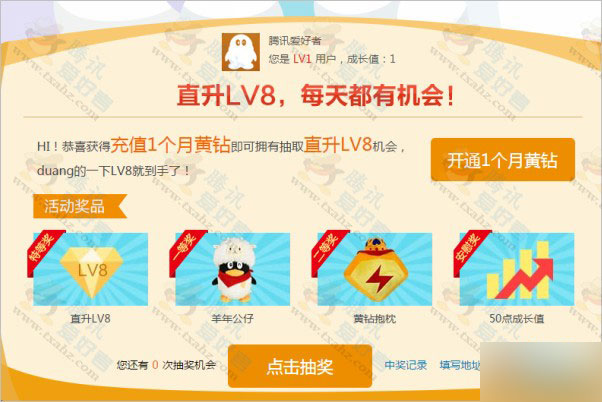 非黄钻用户,充值1个月黄钻即可抽取直升LV8机会。