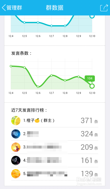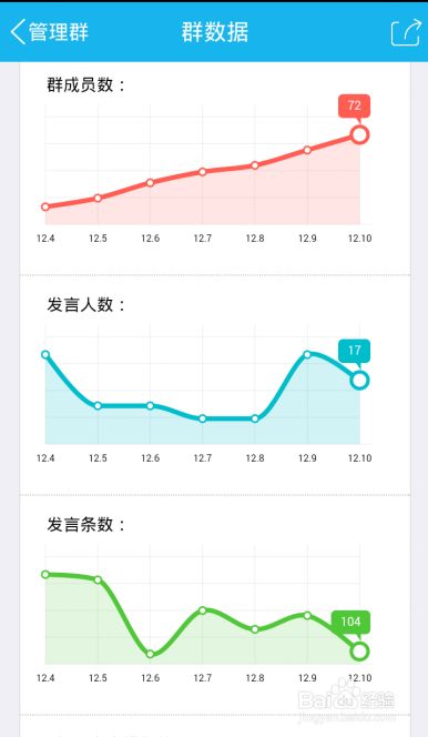 5、这时,我们可以看到该群的群成员数量变化趋势、发言人数、发言数量变化等等,以便于群管理员的实时掌控活跃度