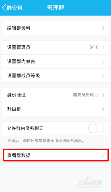 4、在打开的群管理页面中,在最下方可以看到查看群数据,打开它