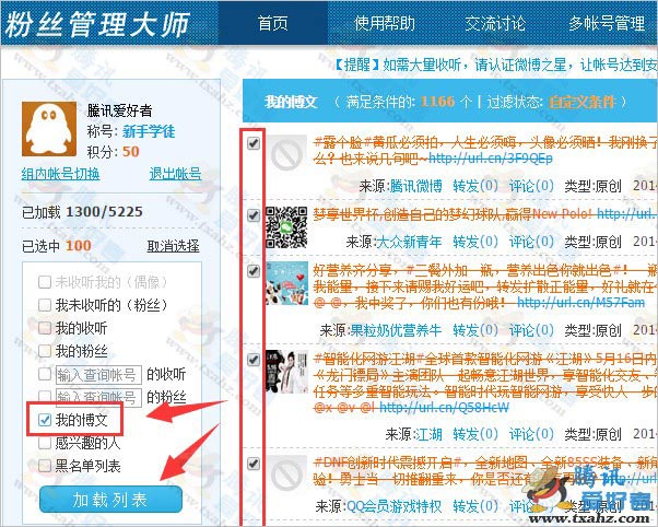 1、打开粉丝管理大师地址 http://qqfans.sinaapp.com/,用腾讯微博帐号一键登录。然后勾选左边“我的博文”,点击“加载列表”;加载后完成后点击下面的“选中本页”或“全选”删除便可。还有其他未收听我的人删除等操作。大家自己看吧!