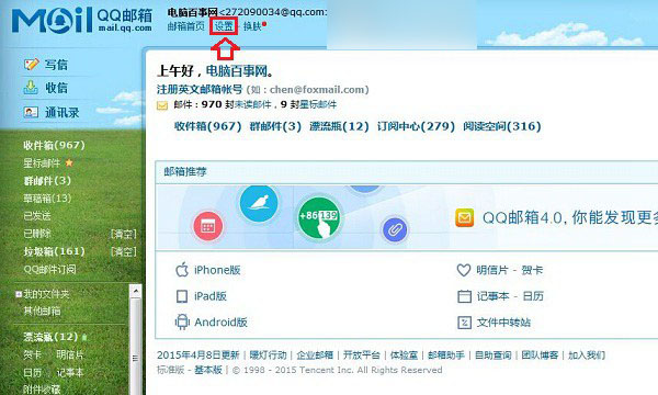 一、首先打开QQ邮箱,可以直接从QQ面板顶部中点击邮箱图标进入,打开QQ邮箱后,点击顶部的“设置”,如下图所示。