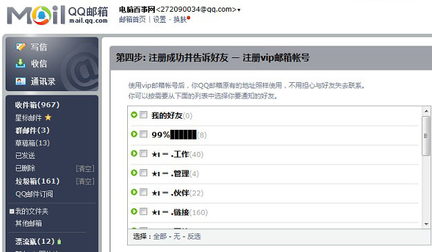 六、注册QQ VIP邮箱第四步,注册成功并告诉好友,您可以按需通知好友,当然也可以跳过此步。