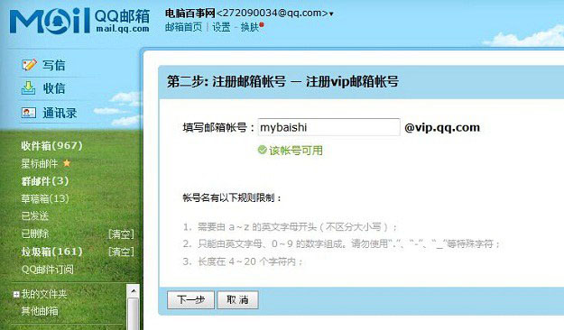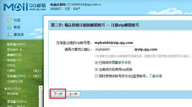 五、注册QQ VIP邮箱第三步,再次确认填写的VIP邮箱账号,完成后继续点击下面的【下一步】,如下图所示。