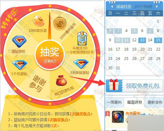 5、在游戏大厅的右侧有 领取免费礼包按钮。转盘抽奖也可以获得蓝钻、抱枕等 , 很简单