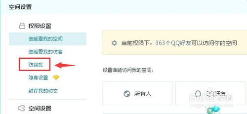 来到空间设置的权限设置页面,再点击左侧设置菜单栏中的“防骚扰”菜单。(如下图)