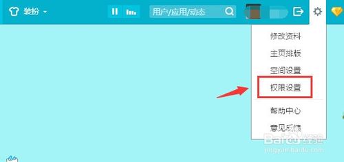 来到QQ空间首页,点击右上角的“设置”图标,在弹出来的功能菜单中,选择“权限设置”。(如下图)