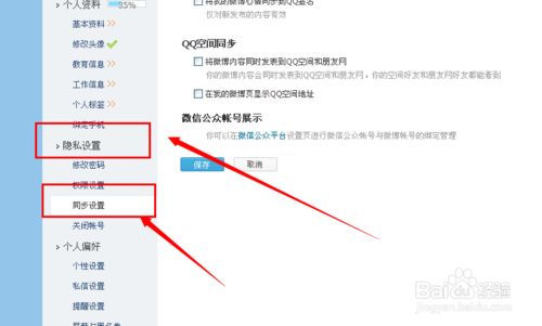 第四,在QQ同步中的第一条找到展示信息的设置,去掉前面的勾选项,然后切记要点击下面的【保存】,才算是更改成功。
