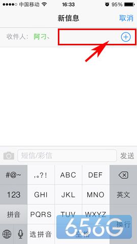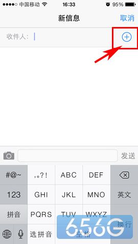 1)首先,进入短信编辑界面,点击右上方的“+”按键,添加收件人。(如下图所示)