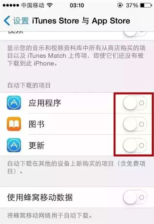 如果你的iPhone在使用时出现卡顿,那可能是因为它正在后台尝试应用升级,而这完全可以通过手动的方式执行。想要更改自动升级应用的设置,你需要进入【设置】-【iTunes Store和App Store】自动下载的项目,然后全部关闭。