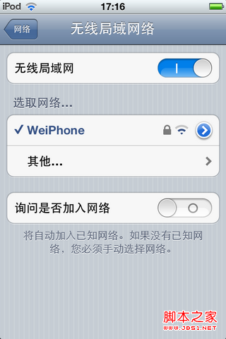 设定 iPhone 询问您是否想要加入新网络: 选取“WiFi”,然后打开或关闭“询问加入网络”。当您尝试访问 Internet(例如通过使用 Safari 或 Mail),并且您不在以前使用过的 WiFi 网络的通信范围内时,此选项会指示 iPhone 查找其他网络。iPhone 会显示所有可用 WiFi 网络的列表,您可以从这些网络中选取一个。(需要密码的络带有锁图标