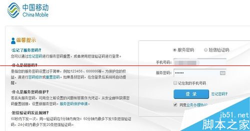 2、登录用户名和密码,如果忘记服务密码可以凭借短信验证码来登录。